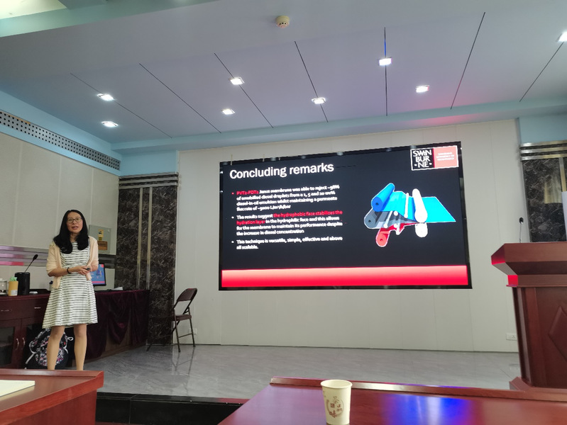 报告中,俞教授首先介绍了当前所研究的主要方向,包括材料应用、生物医学应用、环境应用和能源等方面。然后从乳液污染来源、膜技术用于乳液分离、Janus膜的设计和制造以及Janus膜用于油水分离等方面介绍团队取得的研究成果。其中,Janus膜具有疏水的一面,当水从亲水性一侧渗透到疏水性一侧时,表现出显著的背压;由静电纺丝制备的Janus膜是采用氧化诱导聚多巴胺涂层进行修饰,充分利用了聚多巴胺优良的粘附性和亲水性。研究结果表明,Janus膜能够在保持较高渗透通量的同时,获得较好的乳液分离效果。最后,俞教授还介绍了澳大利亚斯维本科技大学的校园环境、科研条件和奖学金政策,鼓励我院本科生和研究生出国交流深造。