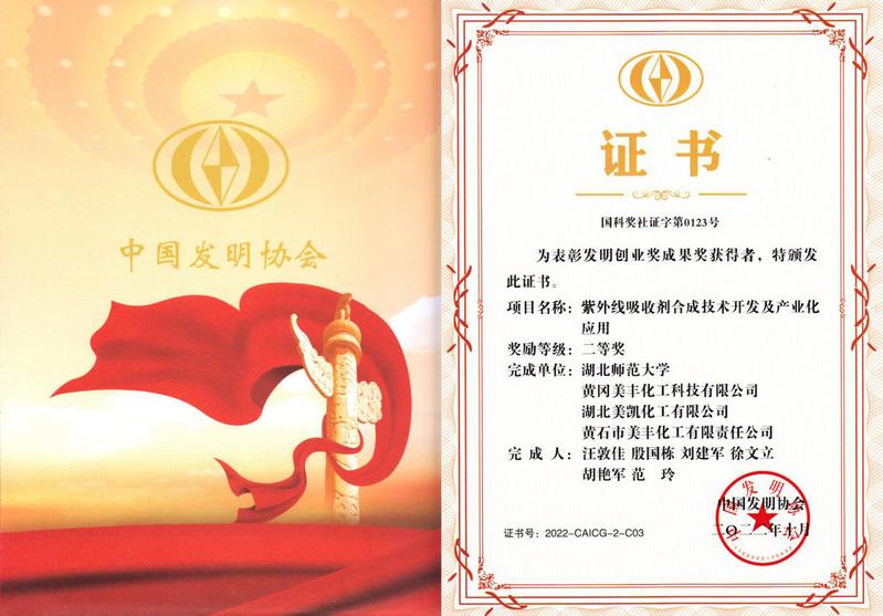 该奖项由湖北师范大学与黄冈美丰化工科技有限公司等共同申报,湖北师范大学为第一完成单位,完成人为我院汪敦佳教授、殷国栋教授、胡艳军教授、范玲副教授。该研究团队经过十几年持续与美峰集团的校企合作,专注于紫外线吸收剂合成关键技术、新产品研发以及绿色化工艺改造等关键技术难题,提升了紫外线吸收剂关键技术自主创新能力,推动了行业技术进步和发展。近年来,团队成员申请国家专利43件,获得授权专利37件,其中发明专利19件,实用新型专利18件;获得中国产学研合作创新奖1项、湖北省技术发明奖二等奖1项、湖北省科技进步奖三等奖6项,并发表SCI收录论文100余篇。在国家、省市和横向项目等30多个课题的支持下,团队完成了20多项小试与中试试验,争取到1500多万元的项目经费资助,校企合作成果“紫外线吸收剂系列产品合成技术”相继投入工业生产。近三年,该项目为地方新增产值13.56亿元,新增利税2.39亿元,创汇1.48亿美元。