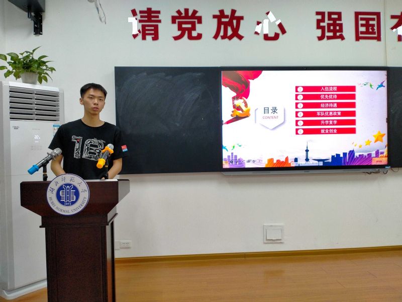 宣讲伊始,吴赞播放征兵宣传片,展示了极为真实鲜活的军旅生活。接着,吴赞从入伍流程、优先优待、经济待遇、军队优惠政策、升学复学、就业创业六个方面介绍了征兵入伍的相关事项。他向大家表露心声:当兵后悔两年,不当兵后悔一辈子。当兵既可强健体魄,又可磨炼意志,提升自我。他希望同学们可以踊跃参军,投身于祖国的文化建设。