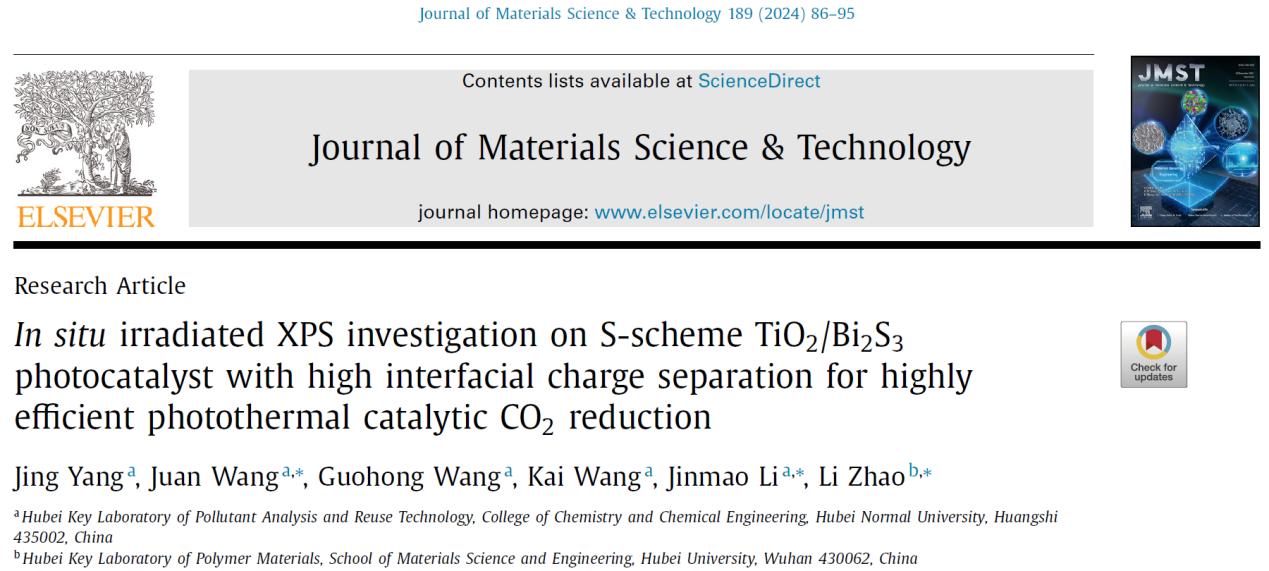 近日,国际知名期刊Journal of Materials Science & Technology(《材料科学技术》)在线发表了我院王娟副教授在光催化CO2还原领域的最新研究成果。论文题为“In situ irradiated XPS investigation on S-scheme TiO2 /Bi2S3 photocatalyst with high interfacial charge separation for highly efficient photothermal catalytic CO2 reduction”(原位XPS研究快速界面电荷分离S型TiO2/Bi2S3还原光热催化剂)。我院2021级硕士研究生杨婧为论文第一作者,王娟副教授、李金懋博士、湖北大学赵丽教授为论文共同通讯作者,湖北师范大学为论文第一通讯单位。Journal of Materials Science & Technology是ELSEVIER出版社旗下工程技术领域期刊、SCI中科院大类一区期刊,最新影响因子为10.9。