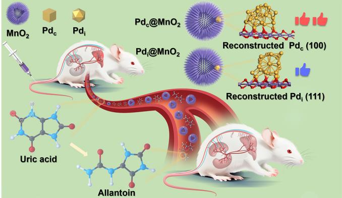 不同晶面控制的Pd@MnO2材料治疗高尿酸血症的示意图