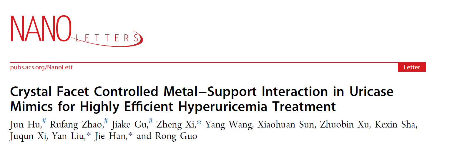 近日,我院赵茹芳博士与扬州大学胡俊博士等合作,在国际知名期刊Nano Letters(《纳米快报》)上在线发表晶面控制金属-载体相互作用在治疗高尿酸血症方面的前瞻性成果。论文题为“Crystal Facet Controlled Metal−Support Interaction in Uricase Mimics for Highly Efficient Hyperuricemia Treatment”(晶面控制金属-载体相互作用用于类尿酸酶在高效高尿酸血症治疗)。扬州大学胡俊博士、我院赵茹芳博士和扬州大学硕士研究生顾佳珂为论文共同第一作者,扬州大学betway西汉姆联官网奚政教授、刘艳教授、韩杰教授为论文共同通讯作者,扬州大学、湖北师范大学分别为论文第一、第二通讯单位。赵茹芳博士负责机理解释和理论计算部分。Nano Letters是ACS(美国化学会)出版社旗下纳米科学和纳米技术领域期刊、SCI中科院大类一区期刊,最新影响因子为10.8。