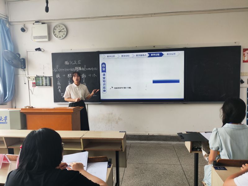经过化学专业各班级推荐,共有34名同学参加学院的初赛。初赛于5月18日举行,初赛胜出的9名同学参加学院复赛。复赛分为教学设计、PPT课件制作、即席演讲、模拟授课及说课等环节。模拟授课要求参赛者的模拟授课内容为中学化学的一个教学片段,授课方式以启发式讲授为主,辅之以板书、板画以及必要的实验、实物演示,知识要点、推演过程等内容采用板书的方式来呈现,将多媒体作为辅助手段,适当安排师生互动,授课时间限定在10分钟内。比赛中,参赛者全面展示了基本素质、专业素养与从教技能,充分展示了师范生基本技能,教学表现异彩纷呈。赛后,李雄建对整个大赛做了总结,对比赛选手的精彩表现给予充分肯定,并就教案设计、授课环节中存在的问题提出了指导性意见建议。
