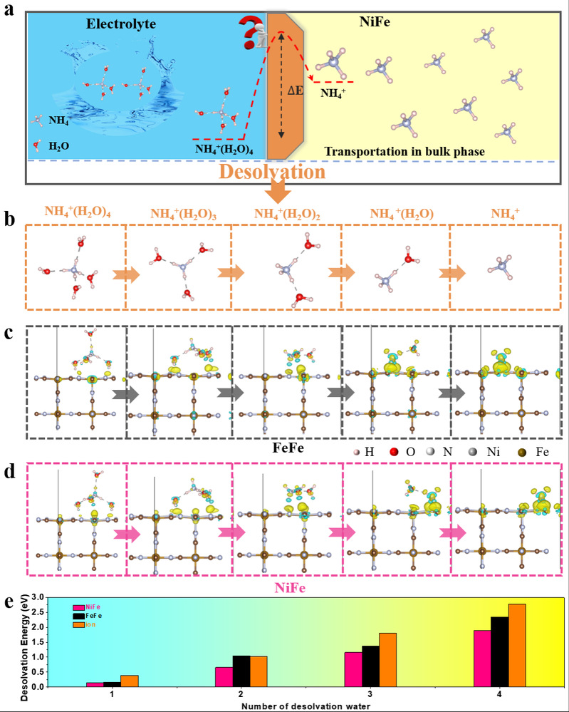 水系铵离子电池(AAIB)是一种以非金属离子(NH4+)为载体的新型储能装置,具有成本低、安全性高、可长期使用等显著优点,但缺乏合适的正极材料。电极-电解液界面的传输动力学(例如,脱溶剂过程)在随后的宿主结构内可逆的NH4+嵌入/脱出过程中起关键作用,但很少被研究。因此,深入研究和理解与NH4+储存机制密切相关的电极-电解液界面的电化学行为,对于设计用于高性能AAIB的长循环稳定正极材料是至关重要的。通过理论模拟首次揭示了调控非对称性双金属位点可以降低NH4+(H2O)4在电极-电解液界面的脱溶能垒,使其脱溶剂化为NH4+进入正极材料。电化学研究结果表明非对称性双金属NiFe位点的引入改善了FeFe-PBA的扩散动力学和结构稳定性。结合原位表征和理论计算表明,NH4+的嵌入/脱出主要归因于NH4+与NiFe-PBA中N原子可逆的相互作用机制。该工作为调控水系储能正极材料的界面脱溶动力学提供了新思路。