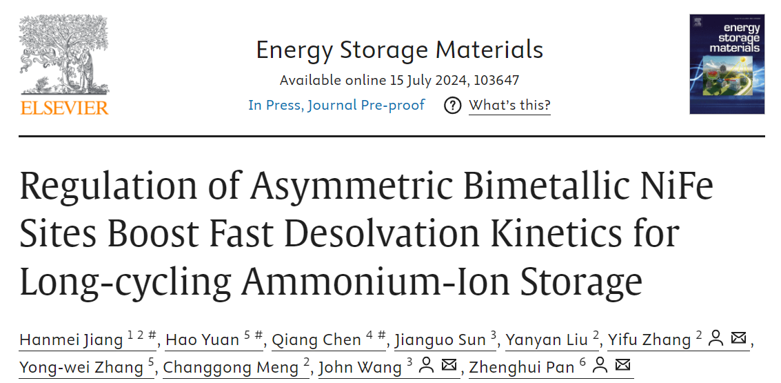 近日,我院江寒梅博士与新加坡国立大学Yuan Hao博士后及浙江工业大学陈强特聘副研究员等合作,在能源材料领域国际顶刊Energy Storage Materials(《储能材料》)上在线发表了PBA材料在水系储铵领域的最新研究成果。论文题为“Regulation of Asymmetric Bimetallic NiFe Sites Boost Fast Desolvation Kinetics for Long-cycling Ammonium-Ion Storage”(非对称性双金属NiFe位点的调控促进长循环铵离子存储的快速脱溶动力学)。我院江寒梅博士、新加坡国立大学Yuan Hao博士后及浙江工业大学陈强特聘副研究员为论文共同第一作者,大连理工大学张依福副教授、新加坡国立大学John Wang院士、同济大学潘争辉教授为论文共同通讯作者,湖北师范大学为论文第一单位。Energy Storage Materials由Elsevier(爱思唯尔)出版社创办,为主要关注电池和超级电容器等能源存储材料领域期刊、SCI中科院大类一区期刊,最新影响因子为18.9。