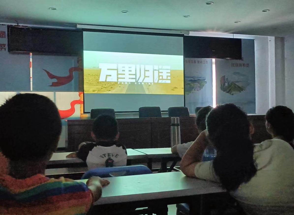 图为小朋友们观看爱国影片。