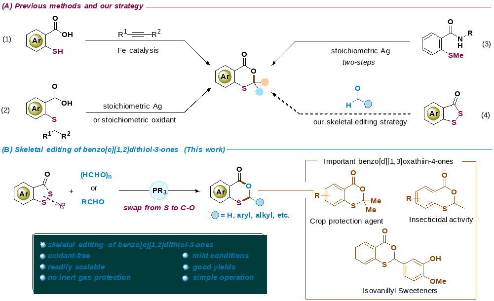 有机分子的后期修饰可以大大增加分子的结构多样性。长期以来,C–H键官能团化是生物活性分子后期修饰的常用手段,可以为药物分子的筛选提供多样的先导化合物。相比于C–H键官能团化的后期修饰,直接对芳香杂环或碳骨架进行特定原子的消除和插入极具挑战性。分子骨架编辑作为自然界创造活性天然产物结构多样性的重要合成工具,如果能对杂环及碳环的核心骨架进行直接编辑,比如消除、替换或者插入特定的原子,则可能改善或者完全改变分子的物化性质、生物活性、药学性质等,为药物活性分子的开发提供强劲的合成策略。目前苯并二磺酚酮分子骨架编辑反应的研究极其罕见。基于此,周耀博士研究团队报道了有机磷介导苯并二磺酚酮的分子骨架编辑反应,实现了苯并二磺酚酮的S原子交换反应,在温和的条件下合成一系列官能团化的1,3-苯并恶硫因-4-酮衍生物。