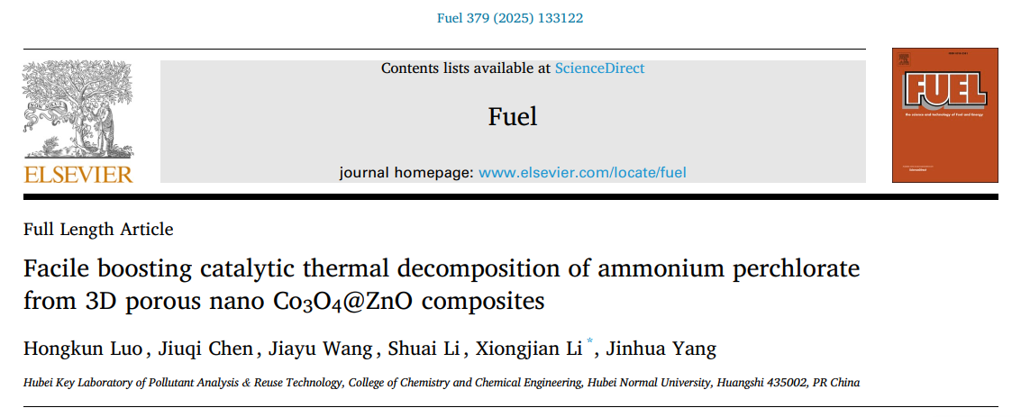 近日,国际知名期刊Fuel(《燃料》)在线发表了我院李雄建博士团队在催化高氯酸铵热分解领域的最新研究成果。论文题为“Facile boosting catalytic thermal decomposition of ammonium perchlorate from 3D porous nano Co3O4@ZnO composites”(三维多孔纳米 Co3O4@ZnO 复合材料可促进高氯酸铵的催化热分解)。2022级硕士研究生罗红坤为论文第一作者,李雄建博士为论文通讯作者,湖北师范大学为论文唯一通讯单位。Fuel是ELSEVIER(爱思唯尔)出版社旗下工程技术领域著名期刊、SCI中科院大类一区期刊,最新影响因子为6.7。