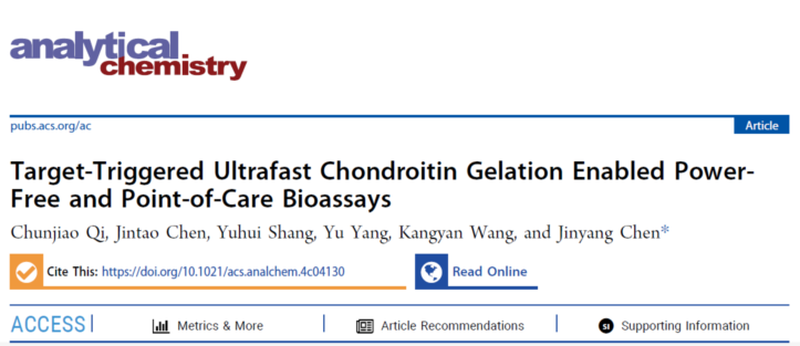 近日,国际知名期刊Analytical Chemistry(《分析化学》)在线发表了我院陈金阳副教授团队在生物传感领域的最新研究成果。论文题为“Target-Triggered Ultrafast Chondroitin Gelation Enabled Power-Free and Point-of-Care Bioassays”(靶标触发超快软骨素凝胶化实现无电即时生物检测)。2022级硕士研究生齐春娇为论文第一作者,陈金阳副教授为论文通讯作者,湖北师范大学为论文唯一通讯单位。Analytical Chemistry是American Chemical Society(美国化学会)出版社旗下分析化学领域顶级期刊,中科院SCI化学大类一区期刊、自然指数期刊,最新影响因子为6.7。
