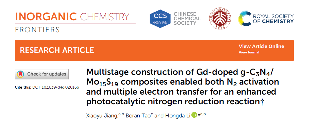 近日,国际知名期刊Inorganic Chemistry Frontiers(《无机化学前沿》)在线发表了我院李宏达博士团队在光催化固氮领域的最新研究成果。论文题为“Multistage construction of Gd-Doped g-C3N4/Mo15S19 Composites Enabled Both N2 activation and multiple electron transfer for Enhanced Photocatalytic Nitrogen Reduction Reaction”(多级构筑Gd掺杂g-C3N4/Mo15S19复合材料促使N2活化和多重电子转移以增强光催化氮还原反应)。李宏达博士为论文唯一通讯作者,湖北师范大学为论文第一单位。Inorganic Chemistry Frontiers是RSC(英国皇家化学会)出版社旗下化学领域期刊、SCI中科院大类一区期刊,最新影响因子为6.1。