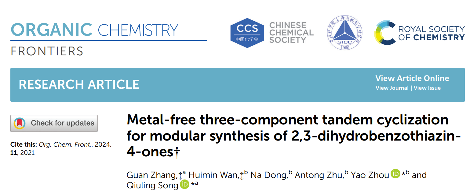 该研究成果于2024年2月发表于中科院SCI大类一区期刊Organic Chemistry Frontiers(IF:4.6)。2020级硕士研究生万慧敏为论文共同第一作者,周耀副教授和福州大学宋秋玲教授为共同通讯作者,福州大学、湖北师范大学分别为论文第一、第二通讯单位。