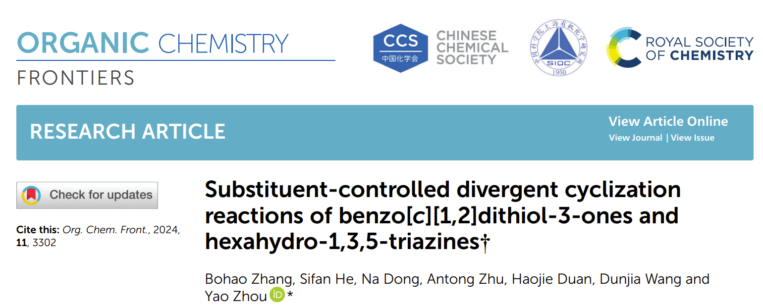 该研究成果于2024年4月发表于中科院SCI大类一区期刊Organic Chemistry Frontiers(IF:4.6),被编辑部选为封面文章。2022级硕士研究生张博浩为论文第一作者,周耀副教授为论文通讯作者,湖北师范大学为论文唯一通讯单位。