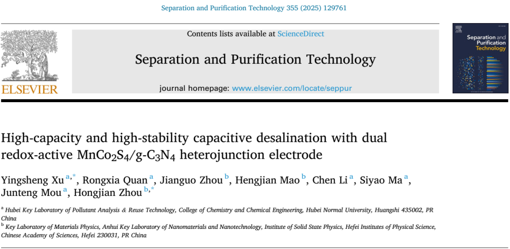 [成果19] 双氧化还原活性MnCo2S4/g-C3N4异质结电极实现高容量高稳定性电容脱盐