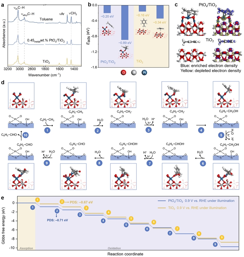 朱玉荃博士主要负责该论文中的理论计算工作。论文报道了在二氧化钛负载亚纳米PtOx团簇(PtOx/TiO2)光阳极上,甲苯光电催化氧化生成苯甲醛(BA),在水介质中,BA的产率为1.75 μmol cm-2 h-1,选择性为83.5%,比原始TiO2高4.4倍。该策略对甲苯衍生物的选择性氧化也同样起效。作为概念验证,还制造了一个具有S型流动通道的自供电光电催化串联装置,用于甲苯的氧化,在光照射下该装置的BA产量为~170 μmol。实验研究结合理论计算结果表明,PtOx/TiO2光阳极上的甲苯氧化遵循亲电羟基(OH*)介导途径,该途径可以抑制BA的过度氧化。此外,亚纳米PtOx团簇被证实可以促进甲苯的吸附和OH*的生成,从而实现了甲苯的高效氧化。该项工作有望拓宽在温和条件下水溶液中C(sp3)–H键的可持续活化途径。