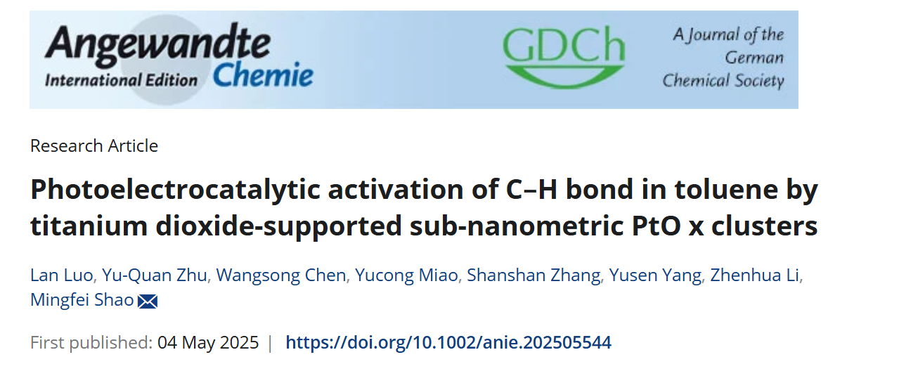 近日,国际期刊Angewandte Chemie International Edition(《德国应用化学》)在线刊发了物理化学教研室朱玉荃博士以“Photoelectrocatalytic activation of C–H bond in toluene by titanium dioxide-supported sub-nanometric PtOx clusters”(二氧化钛负载亚纳米PtOx团簇光电催化活化甲苯中C–H键)为题的学术论文。朱玉荃博士为论文共同第一作者。Angewandte Chemie International Edition由Wiley出版社1962年创办,是化学领域的权威期刊,SCI中科院大类一区TOP期刊、自然指数期刊,最新影响因子为16.6。