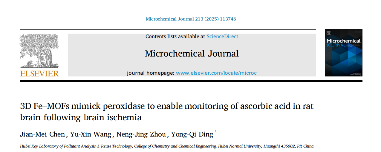 4月,国际知名期刊Microchemical Journal(《微化学杂志》)在线发表该团队在多功能纳米材料活体分析领域的最新研究成果。论文题为“3D Fe–MOFs Mimick Peroxidase to Enable Monitoring of Ascorbic Acid in Rat Brain Following Brain Ischemia”(三维六角钟形Fe-MOFs纳米酶实现缺血性脑损伤大鼠脑内抗坏血酸水平的比色测定)。2024级硕士研究生陈剑梅为论文第一作者,丁永奇博士为通讯作者,湖北师范大学为论文第一单位。Microchemical Journal是Elsevier(爱思维尔)出版社旗下分析化学领域期刊、SCI中科院大类二区期刊,最新影响因子为4.9。