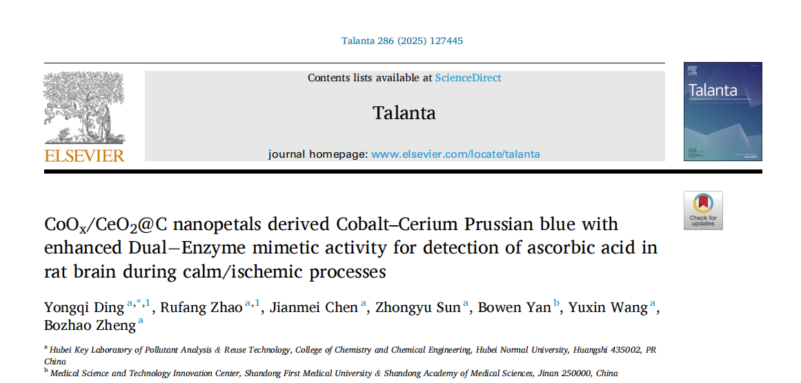 去年12月,国际知名期刊Talanta(《塔兰塔》)发表了我院分析化学教研室丁永奇博士团队在多功能纳米材料活体分析领域的最新研究成果。论文题为“CoOx/CeO2@C Nanopetals Derived Cobalt–Cerium Prussian Blue with Enhanced Dual−Enzyme Mimetic Activity for Detection of Ascorbic Acid in Rat Brain During Calm/Ischemic Processes”(基于钴-铈普鲁士蓝的衍生物CoOxCeO2@C纳米花瓣的双重模拟酶活性用于检测小鼠大脑中平静缺血过程中的抗坏血酸)。丁永奇博士和物理化学教研室赵茹芳博士为论文共同第一作者,丁永奇博士为论文通讯作者,湖北师范大学为论文第一单位。Talanta是Elsevier(爱思维尔)出版社旗下分析化学领域期刊、SCI中科院大类一区期刊(2023年12月升级版),最新影响因子为5.6。