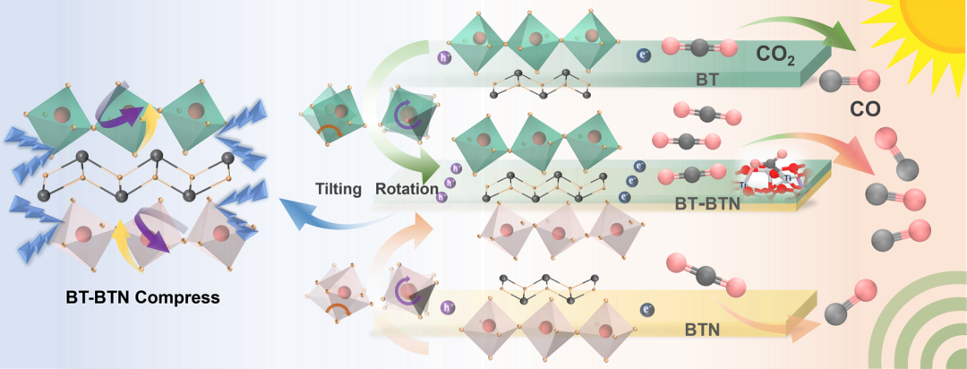 共生层状结构铁电体,由于其内部固有的强自发极化电场,能够持续有效地驱动载流子的分离与迁移,使其成为极具潜力的压电光催化材料。该工作通过简单一步水热法制备了具有强自发极化的共生铁电薄层纳米片Bi7Ti4NbO21 (BT-BTN),并将其应用于压电光催化CO2还原领域。密度泛函理论(DFT)计算结果表明,层间晶格失配引起的八面体倾斜和旋转角度变化是极化增强的主要原因,并且在外界应力作用下会进一步增强。BT-BTN中氧八面体沿a轴和a-b平面内具有较大的倾斜角和旋转角,这种变化破坏了晶体对称性,导致面外铁电自旋极化和极化场强度的增强。当BT-BTN受到应力作用时,其内部八面体的变化会进一步增强极化电场的强度,从而产生更强的压电极化电场,驱动载流子的分离与迁移,实现高效的压电光催化还原性能。该研究为理解高性能共生铁电压电光催化剂的催化机制提供了全新的视角和方向,同时也为开发新型高效能源转换与环境治理技术开辟了新的路径。