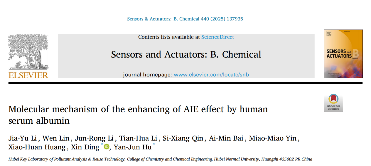 5月,Sensors and Actuators B: Chemical(《传感器和执行器B:化学》)在线发表该团队研究成果,论文题为“Molecular mechanism of the enhancing of AIE effect by human serum albumin”(《人血清白蛋白增敏AIE分子荧光的作用机制》)。我院2022级硕士研究生李佳雨为论文第一作者,胡艳军教授和丁鑫博士为通讯作者,湖北师范大学为论文唯一通讯单位。Sensors and Actuators B: Chemical是Elsevier出版社旗下的化学领域期刊,SCI中科院大类一区TOP期刊,最新影响因子为8.0。