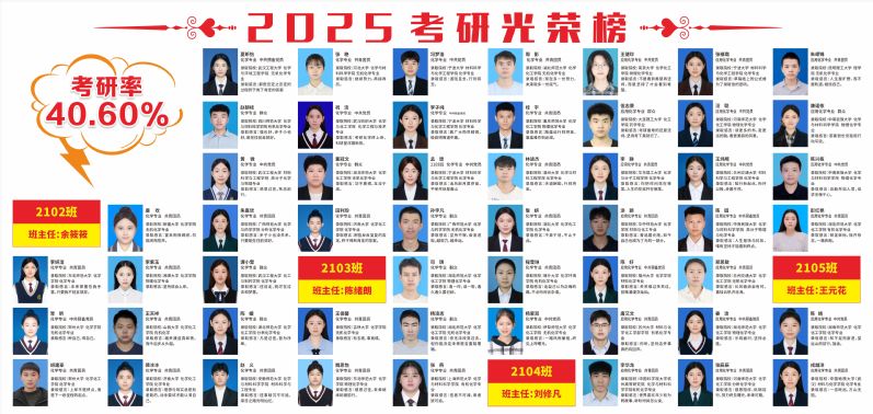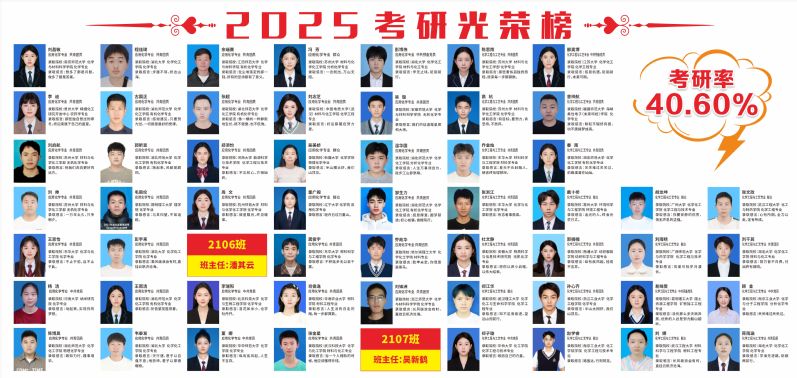 人才培养质量一流。学院承担湖北省高校“荆楚卓越教师协同育人计划”项目和“荆楚优师计划”培养项目。学院积极指导学生参加全国大学生化学实验创新设计大赛、全国大学生化工设计竞赛、全国师范院校师范生教学技能竞赛、全国高等师范院校大学生化学实验邀请赛、湖北省普通高等学校大学生化学实验技能竞赛、湖北省大学生化学(化工)学术创新成果报告会、湖北省大学生优秀科研成果等学科竞赛,学生每年获国家级学科竞赛奖励10余项、省级学科竞赛奖励20余项。近年来,毕业生就业率一直稳定在95%以上,考研录取率稳定在40%以上,2024届、2025届本科生考研录取率分别达到42.76%和40.60%。学院近年来培养研究生300余名,一大批研究生考取名校博士。人才培养质量得到用人单位广泛认可和赞誉。
