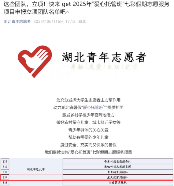 星火筑梦实践队入选2025年湖北省“爱心托管班”七彩假期志愿服务项目,全省共确定904支立项队伍。该项目由湖北省志愿者协会组织实施,旨在助力湖北省暑假“爱心托管班”提质扩面,帮助有需要的少年儿童度过安全、充实而又快乐的暑假。实践队从7月4日起前往阳新县排市镇初级中学开展为期三周的支教,将承担七年级、八年级共6个班的教学管理和九年级4个班的活动课开展。支教期间将严格按照排中的作息实践要求,进行早自习、文化课学习、活动课开展和晚自习等方面的教学与管理工作。指导老师为辅导员郭先哲,化学2404班李玉珠和外语2301班詹欣怡同学为队长。