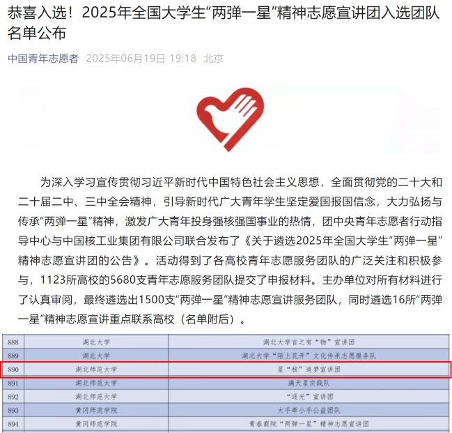 星“核”追梦宣讲团入选2025年全国大学生“两弹一星”精神志愿宣讲团,全国共有1500支服务团队入选。该项目由团中央青年志愿者行动指导中心与中国核工业集团联合举办,旨在引导新时代广大青年学生坚定爱国报国信念,大力弘扬与传承“两弹一星”精神,激发广大青年投身强核强国事业的热情。宣讲团将深入社区、中小学校开展“两弹一星”的研制历史与形成的伟大精神、核能利用现状和核能相关的科普开展宣讲。指导老师为辅导员郭先哲,应用化学2306班王宇欣同学为队长。