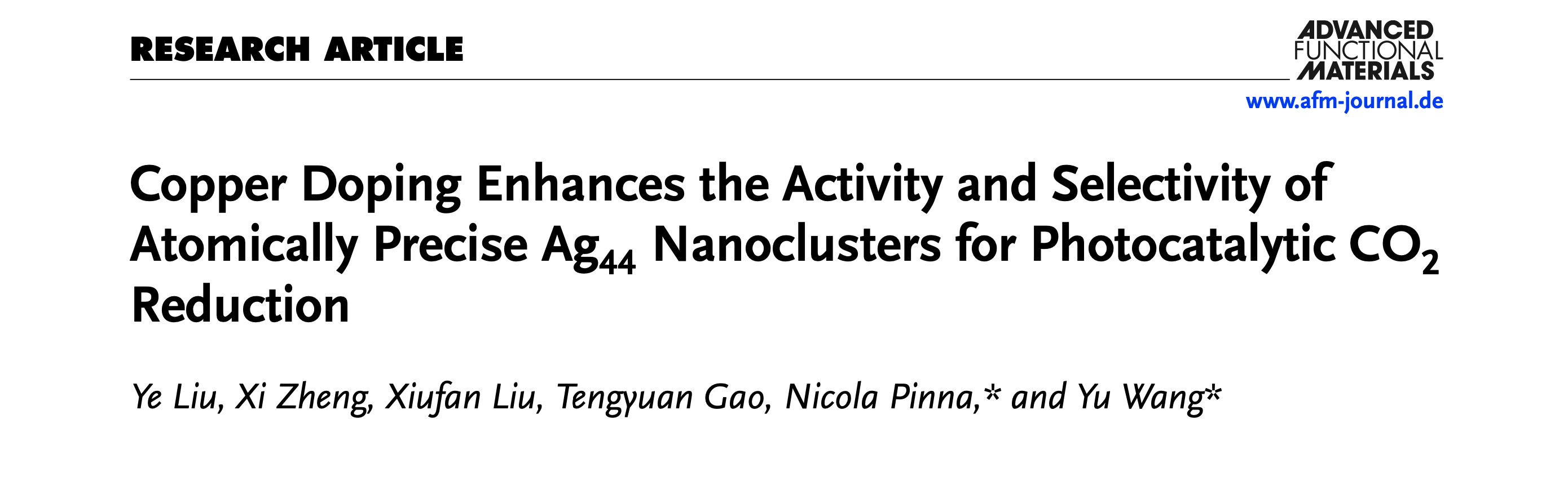 7月17日,国际权威期刊Advanced Functional Materials(《先进功能材料》)在线发表了物理化学教研室刘野博士在银-铜双金属纳米团簇的合成和催化研究中取得的最新研究成果。论文题目“Copper Doping Enhances the Activity and Selectivity of Atomically Precise Ag44 Nanoclusters for Photocatalytic CO2 Reduction”( 铜掺杂提升原子级精确 Ag44纳米簇在光催化 CO2还原中的活性与选择性)。刘野博士为论文第一作者,湖北师范大学为论文第一单位,柏林洪堡大学(Humboldt-Universität zu Berlin)化学院王羽博士和Nicola Pinna教授为共同通讯作者。Advanced Functional Materials由Wiley出版社2001年创办,是材料科学领域的权威期刊、SCI中科院大类一区TOP期刊、Nature Index期刊,最新影响因子为18.2。