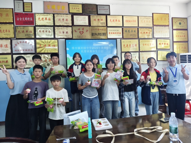 七月的校园,因爱心托管班的欢声笑语而格外热闹;成长的时光,因集体的温暖陪伴而更显珍贵。7月24日下午,我院星火筑梦实践队在排市镇初级中学2025年暑期爱心托管班中,为暑期过生日的同学们精心策划了一场集体生日会。生日会以“温情相聚,共庆成长”为主题,通过趣味互动、暖心祝福等环节,让学子们在托管时光里收获了一份特殊的生日记忆。
