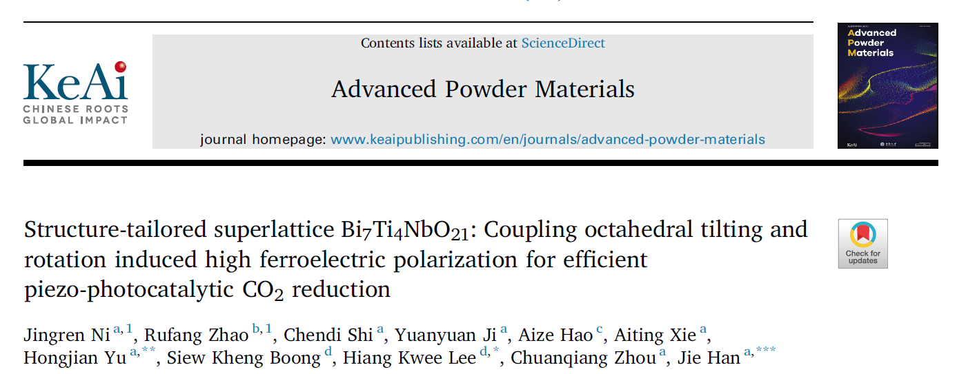 该成果于2025年4月发表于中科院SCI大类一区Advanced Powder Materials(IF:28.6),扬州大学倪敬仁博士为论文第一作者,赵茹芳博士为共同第一作者,扬州大学于洪鉴教授、韩杰教授以及南洋理工大学Hiang Kwee Lee教授为论文共同通讯作者,湖北师范大学为论文第二通讯单位。