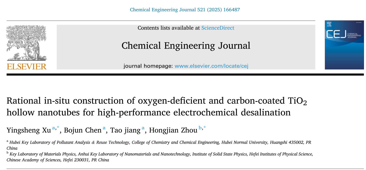 该成果于2025年1月发表于中科院SCI大类一区Desalination(IF:9.8),徐应生博士和中科院合肥物质研究院周宏建研究员为论文共同通讯作者,湖北师范大学为论文第二通讯单位。