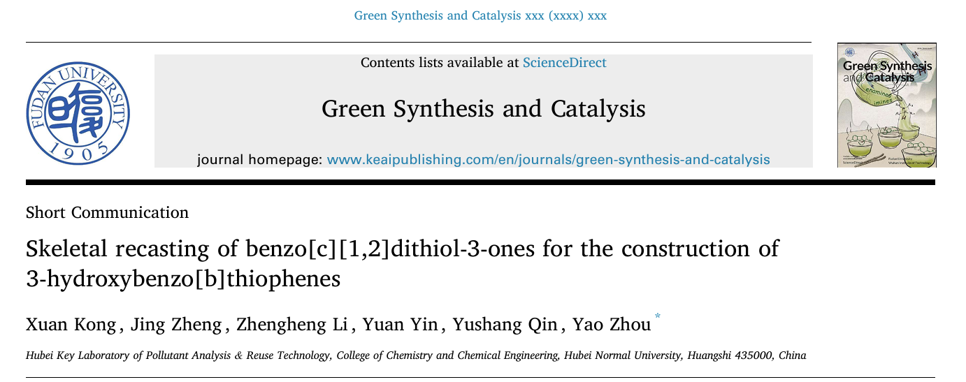 该成果于2025年8月发表于中科院SCI大类一区Green Synthesis and Catalysis(IF:6.3),2023级硕士研究生孔暄为论文第一作者,周耀副教授为论文通讯作者,湖北师范大学为论文唯一通讯单位。