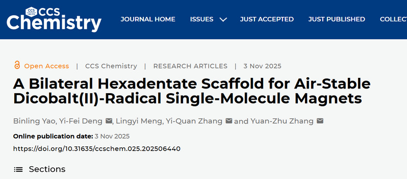 近日,CCS Chemistry(《CCS化学》)在线发表我院无机化学教研室姚彬玲博士的最新研究成果。论文题目为“A Bilateral Hexadentate Scaffold for Air-Stable Dicobalt(II)-Radical Single-Molecule Magnets”(基于双边六齿配体骨架构建的空气稳定双钴(II)自由基单分子磁体)。姚彬玲博士为论文第一作者,南方科技大学张元竹教授、邓义飞助理教授、南京师范大学张义权教授为共同通讯作者,湖北师范大学为论文第二通讯单位。CCS Chemistry是中国化学会主办并自主运营的旗舰综合化学国际期刊,主要报道化学各领域具有国际影响力的原创研究进展,是中科院一区TOP期刊,最新影响因子为9.2。
