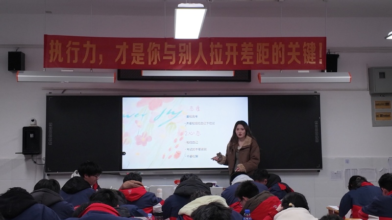 在经验分享环节,宣讲队特别设置了“高考备战指南”专题。大屏幕上,“重视高考”、“相信自己”、“不要松懈”等关键词逐一呈现,这不仅是简单的经验传递,更是四位学长学姐结合自身从致远中学走向湖北师范大学的真实心路历程,为学弟学妹们注入的一剂“强心针”。