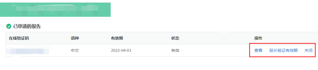 3. 点击申请即可生成相应报告,然后直接查看即可。对于已经申请过的但目前已过期的报告,可以通过设置延长验证有限期来查看,此处需要注意,在线验证报告有效期为6个月。