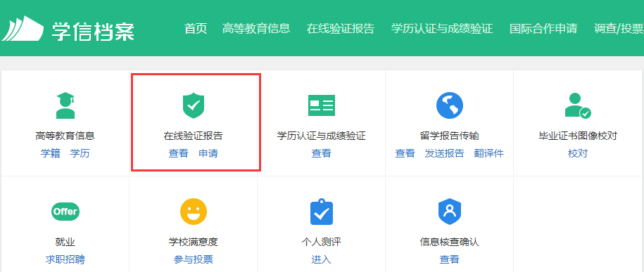 2. 登录后在主页面就可以看到在线验证报告,点击申请《教育部学籍在线验证报告》。退役士兵(往届毕业生)点击申请《教育部学历证书电子注册备案表》。